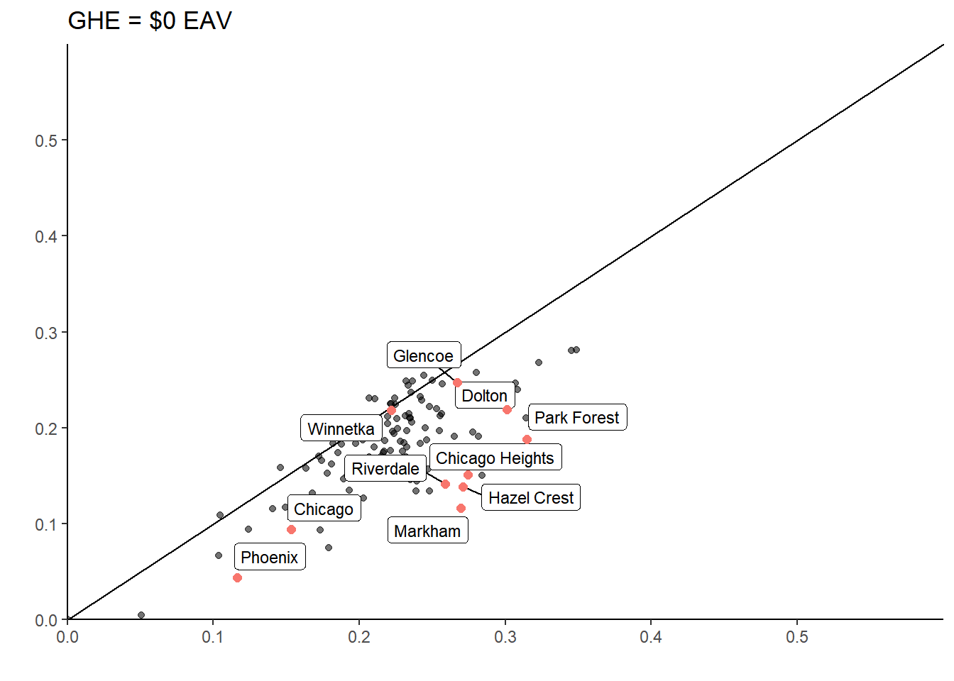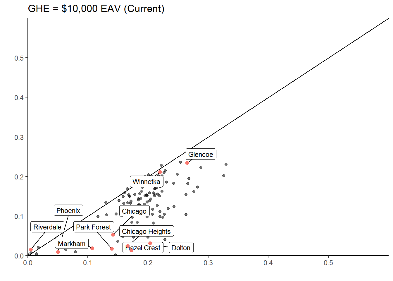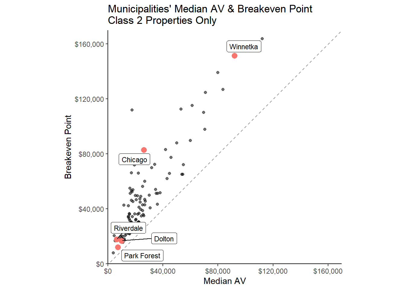 muni_breakeven_points %>%filter(nochange_av <300000) %>%ggplot(aes(y=nochange_av, x = median_AV, label=clean_name )) +geom_abline(intercept =0, slope =1, lty =2, alpha = .4) +geom_point(aes(alpha = .5)) +geom_point(data = (muni_breakeven_points %>%filter(clean_name %in%c("Park Forest", "Chicago", "Winnetka", "Riverdale","Dolton"))), aes(y = nochange_av, x = median_AV, color ="red"), size =3) + ggrepel::geom_label_repel(data = (muni_breakeven_points %>%filter(clean_name %in%c("Park Forest", "Chicago", "Winnetka", "Riverdale", "Dolton"))), aes(y = (nochange_av), x = (median_AV)), size =3)+theme_classic() +theme(panel.background =element_blank()) +scale_x_continuous(labels = scales::dollar, expand =c(0,0), limits =c(0,170000) ) +scale_y_continuous(labels = scales::dollar, expand =c(0,0), limits =c(0,170000) ) +theme(legend.position ="none") +labs(title ="Municipalities' Median AV & Breakeven Point \nClass 2 Properties Only",y ="Breakeven Point", x ="Median AV", # caption = "The breakeven point is the assessed values at which a major class 2 property would not have their taxbill change if the # GHE were eliminated. Excludes outliers: University Park, Bedford Park, McCook, Hodgkins, and Rosemont. Class 2 properties that had# claimed the GHE would have lower taxbills even if the GHE were removed if the AV is above the breakeven point." ) +coord_fixed()#ggsave("breakevenpoint.svg", bg = "transparent")