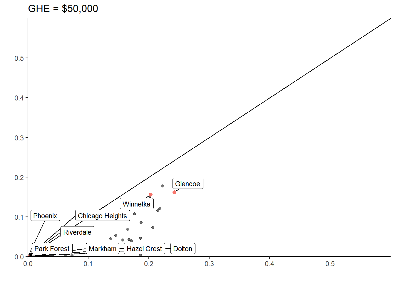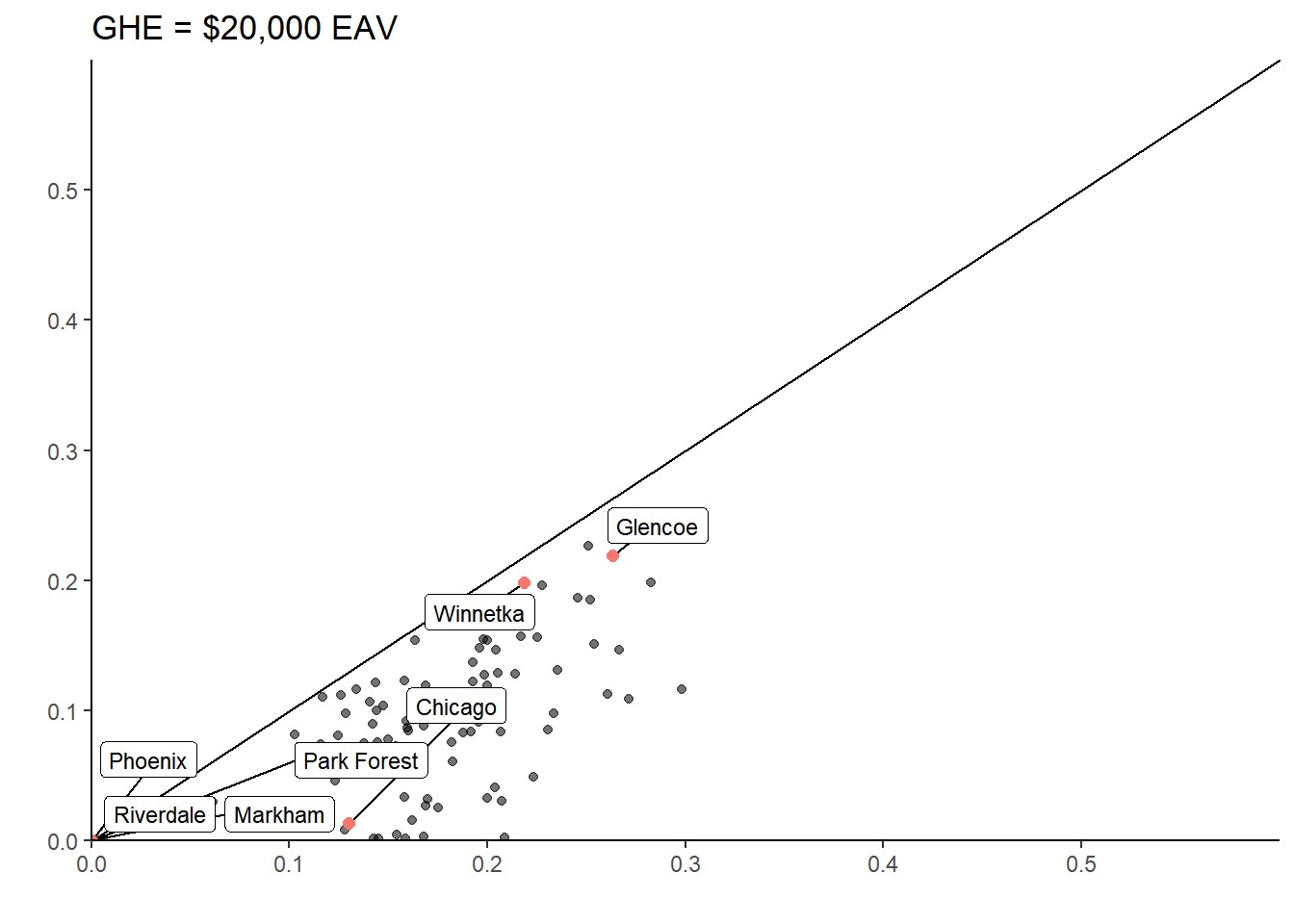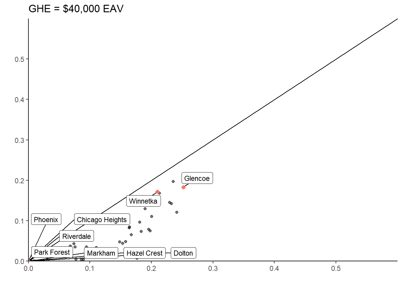 muni_breakeven_points %>%filter(nochange_av <300000) %>%ggplot(aes(y=nochange_av, x = median_AV, label=clean_name )) +geom_abline(intercept =0, slope =1, lty =2, alpha = .4) +geom_point(aes(alpha = .5)) +geom_point(data = (muni_breakeven_points %>%filter(clean_name %in%c("Park Forest", "Chicago", "Winnetka", "Riverdale","Dolton"))), aes(y = nochange_av, x = median_AV, color ="red"), size =3) + ggrepel::geom_label_repel(data = (muni_breakeven_points %>%filter(clean_name %in%c("Park Forest", "Chicago", "Winnetka", "Riverdale", "Dolton"))), aes(y = (nochange_av), x = (median_AV)), size =3)+theme_classic() +theme(panel.background =element_blank()) +scale_x_continuous(labels = scales::dollar, expand =c(0,0), limits =c(0,170000) ) +scale_y_continuous(labels = scales::dollar, expand =c(0,0), limits =c(0,170000) ) +theme(legend.position ="none") +labs(title ="Municipalities' Median AV & Breakeven Point \nClass 2 Properties Only",y ="Breakeven Point", x ="Median AV", # caption = "The breakeven point is the assessed values at which a major class 2 property would not have their taxbill change if the # GHE were eliminated. Excludes outliers: University Park, Bedford Park, McCook, Hodgkins, and Rosemont. Class 2 properties that had# claimed the GHE would have lower taxbills even if the GHE were removed if the AV is above the breakeven point." ) +coord_fixed()#ggsave("breakevenpoint.svg", bg = "transparent")
