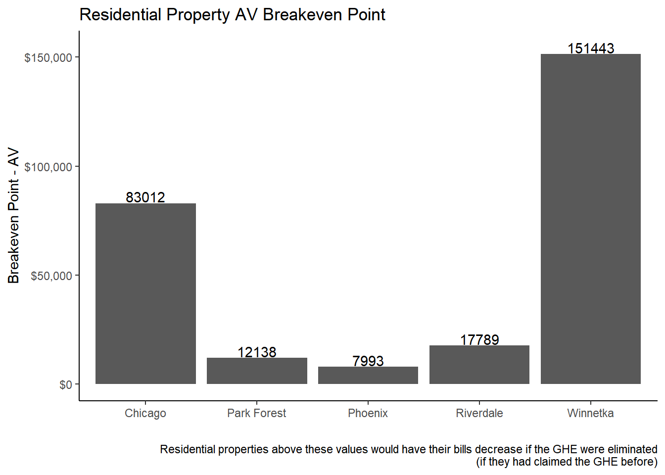 muni_breakeven_points <- c2pins |>left_join(muni_rates) |>filter(exe_homeowner ==10000) %>%filter(exe_senior ==0& exe_freeze ==0& exe_longtime_homeowner ==0& exe_disabled ==0& exe_vet_returning ==0& exe_vet_dis_lt50 ==0& exe_vet_dis_50_69 ==0& exe_vet_dis_ge70 ==0& exe_abate ==0& exe_missing_disvet ==0) %>%group_by(clean_name) %>%summarize(median_AV =median(av), # median class 2 AV for properties that did claim the GHE but not other exemptionsbill_current =mean(eav_postexemptions * tax_code_rate), # money collected by non-TIF agenciesbill_noGHE =mean(rate_noGHE * (eav_postexemptions+exe_homeowner)), # this uses tax code tax rate# rate_change = mean(tax_code_rate - tc_hyp_taxrate), # avg tax code level rate change muni_avg_rate_change =mean(tax_code_rate - rate_noGHE),# nobillchange_propertyEAV = round(mean(exe_homeowner * # (tax_code_rate / (tax_code_rate-tc_hyp_taxrate)))), # nobillchange_propertyEAV_muni =round(mean(exe_homeowner * (rate_current/(rate_current-rate_noGHE) ))) ) |>mutate(nochange_av = nobillchange_propertyEAV_muni / eq_factor,nochange_av_muni = nobillchange_propertyEAV_muni/ eq_factor, ) muni_breakeven_points %>%filter(clean_name %in%c("Chicago","Park Forest", "Phoenix", "Riverdale", "Winnetka")) |>ggplot(aes(y=median_AV, x = clean_name)) +geom_col()+geom_text(aes(y=median_AV +3000, label =round(median_AV) ) ) +scale_y_continuous(labels = scales::dollar) +theme_classic() +scale_x_discrete(label =c("Chicago","Park Forest", "Phoenix", "Riverdale", "Winnetka")) +labs(y ="Median Residential AV", x ="", title ="Median Residential Property Assessed Value - All Class 2 property Types")muni_breakeven_points %>%filter(clean_name %in%c("Chicago","Park Forest", "Phoenix", "Riverdale", "Winnetka")) |>ggplot(aes(y=nochange_av, x = clean_name)) +geom_col() +geom_text(aes(y=nochange_av +3000, label =round(nochange_av)) ) +scale_y_continuous(labels = scales::dollar) +theme_classic() +scale_x_discrete(label =c("Chicago", "Park Forest", "Phoenix", "Riverdale", "Winnetka")) +labs(y ="Breakeven Point - AV", x ="", title ="Residential Property AV Breakeven Point", caption ="Residential properties above these values would have their bills decrease if the GHE were eliminated (if they had claimed the GHE before)")