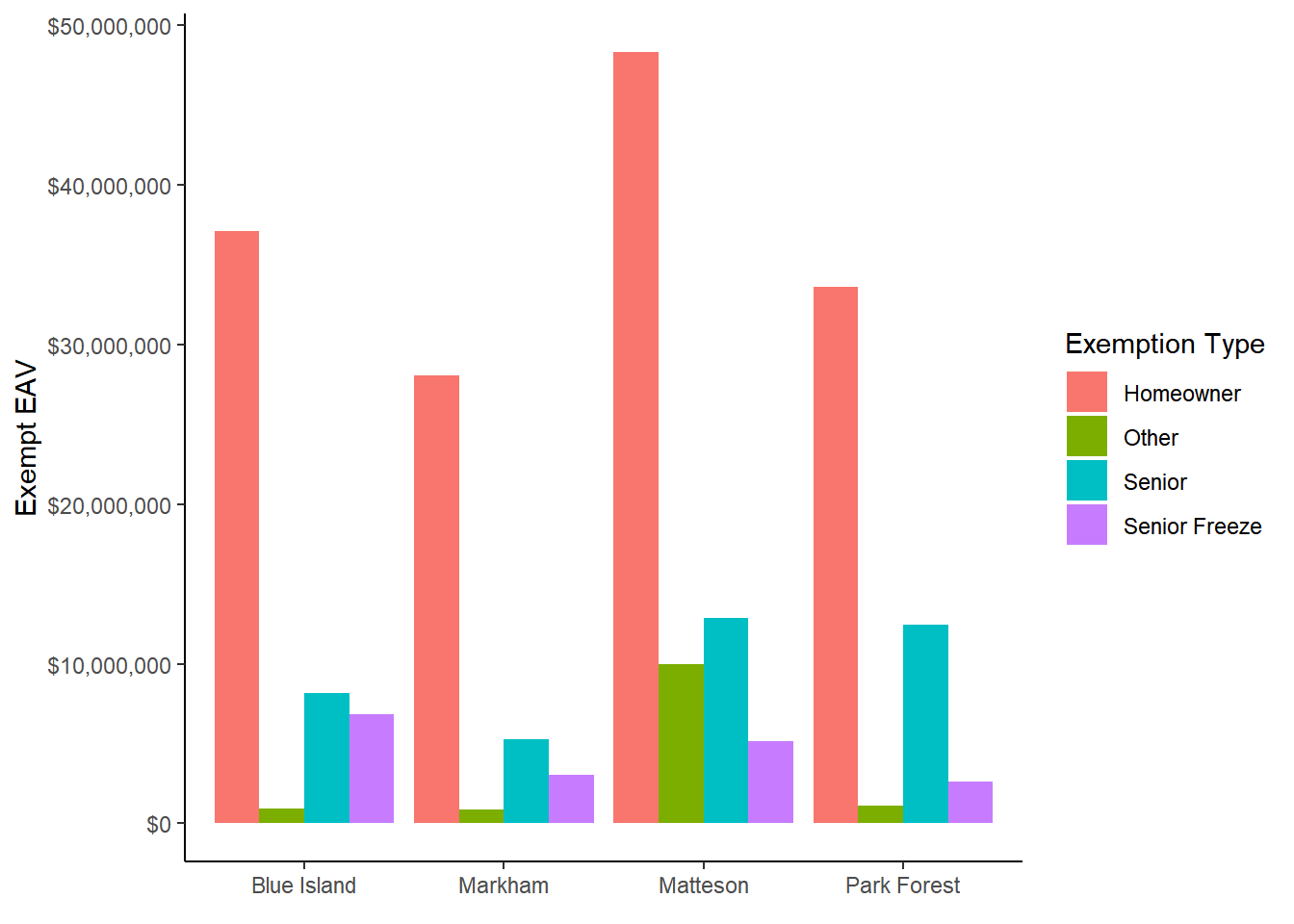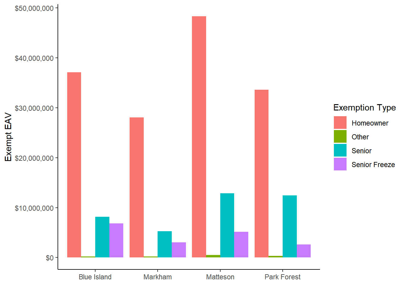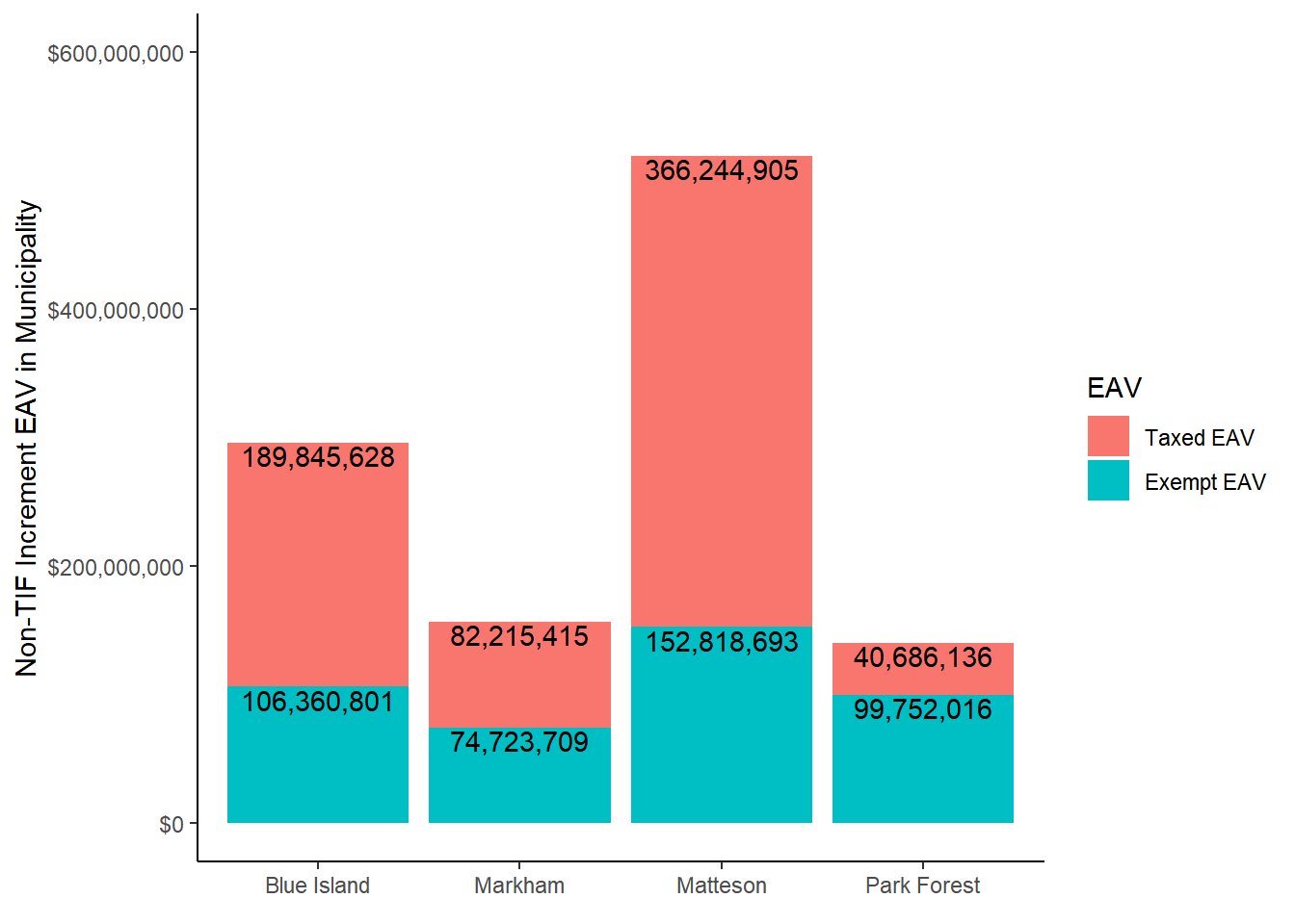 pin_data %>%group_by(clean_name) %>%summarize(all_exemptions =sum(exe_total_adj),eq_av =sum(av_clerk*eq_factor),tif_increment_eav =sum(final_tax_to_tif/tax_code_rate) ) %>%mutate(taxable_eav = eq_av - tif_increment_eav - all_exemptions) |>filter(clean_name %in%c("Blue Island", "Markham", "Matteson", "Park Forest")) %>%pivot_longer(cols =c(all_exemptions:taxable_eav), names_to ="exe_type") %>%# all exemptions includes all exemptions, but adjusted for missing disabled veteran exemptions filter(exe_type %in%c("taxable_eav", "all_exemptions"))|>mutate(EAV =factor(exe_type, levels =c("taxable_eav", "all_exemptions"), labels =c("Taxed EAV", "Exempt EAV")) ) |>ggplot() +geom_col(aes(x=clean_name, y = value, fill = EAV), position ="stack") +scale_y_continuous(label = scales::dollar, limits =c(0,600000000)) +theme_classic() +geom_text(aes(x=clean_name, y = value, label = scales::comma(value)), position ="stack", vjust=1.1)+labs(x =element_blank(), y ="Non-TIF Increment EAV in Municipality")