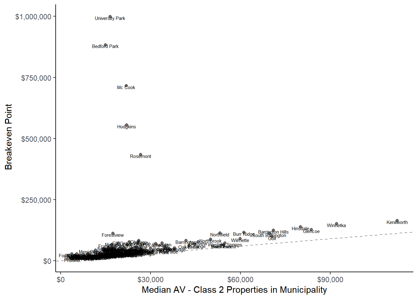 muni_breakeven_points %>%# filter(nochange_av < 300000) %>%ggplot(aes(y=nochange_av, x = median_AV, label=clean_name )) +geom_abline(intercept =0, slope =1, lty =2, alpha = .4) +geom_point(aes(alpha = .5)) +# geom_smooth(method = "lm" )+geom_text(aes(y = (nochange_av-5000), x = (median_AV)), size =2)+theme_classic() +scale_x_continuous(labels = scales::dollar) +scale_y_continuous(labels = scales::dollar) +theme(legend.position ="none")+labs(y =" Breakeven Point", x ="Median AV - Class 2 Properties in Municipality", # title = "Some highly valued homes would have lower tax bills if the GHE were eliminated", #caption = "The breakeven point is the assessed values at which a major class 2 # property would not have their taxbill change if the GHE were eliminated." )