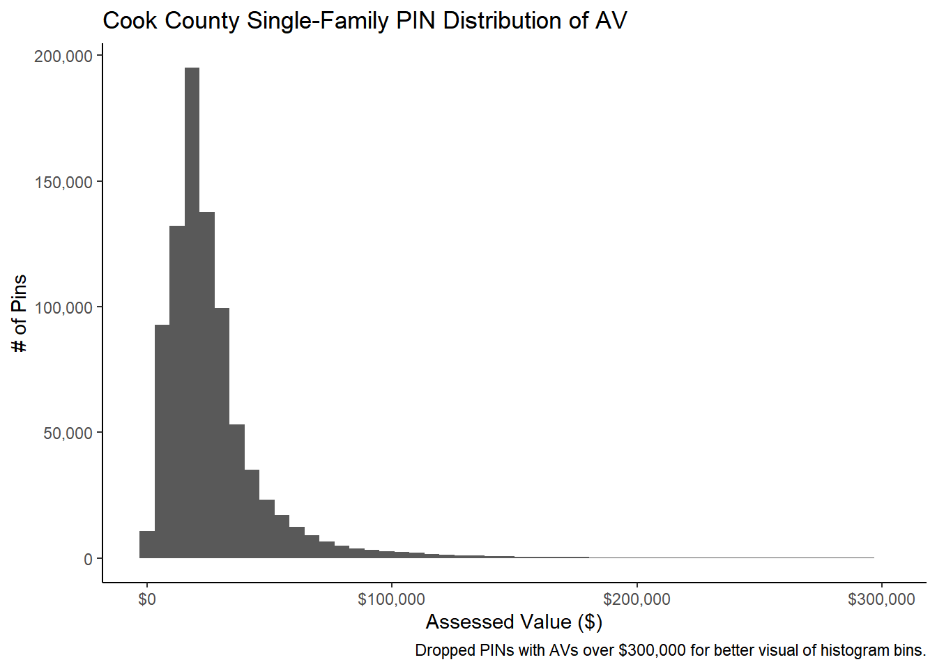 pin_data %>%filter(av <300000) %>%# just to see the histogram betterggplot( aes(x=av)) +geom_histogram(bins =50) +theme_classic()+labs(title ="Cook County Class 2 Residential PIN Distribution of AV", x ="Assessed Value ($)", y="# of Pins", caption ="Dropped PINs with AVs over $300,000 for better visual of histogram bins.") +scale_x_continuous(label = scales::dollar) +scale_y_continuous(label = scales::comma)singfam_pins %>%filter(av <300000) %>%# just to see the histogram betterggplot( aes(x=av)) +geom_histogram(bins =50) +theme_classic()+labs(title ="Cook County Single-Family PIN Distribution of AV", x ="Assessed Value ($)", y="# of Pins", caption ="Dropped PINs with AVs over $300,000 for better visual of histogram bins." ) +scale_x_continuous(label = scales::dollar)+scale_y_continuous(label = scales::comma)