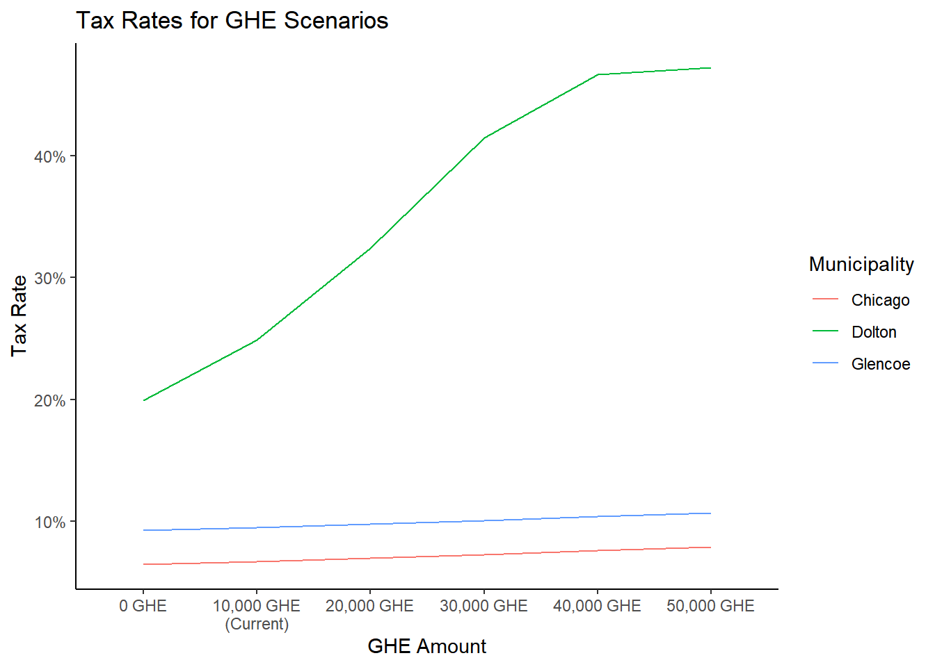 # Calculates tax rates for all exemption scenarios.scenario_calcs <- pin_data %>%group_by(clean_name) %>%summarize(MuniLevy =round(sum(final_tax_to_dist, na.rm =TRUE)), # amount billed by munis with current exemptions in placecurrent_nonTIF_EAV_post_exemps =sum(final_tax_to_dist/(tax_code_rate), na.rm =TRUE),current_TIF_increment_EAV =sum(final_tax_to_tif/(tax_code_rate), na.rm=TRUE), current_Exempt_EAV =sum(all_exemptions, na.rm=T), current_GHE =sum(exe_homeowner, na.rm=TRUE),Total_EAV =sum(all_exemptions+(final_tax_to_dist+final_tax_to_tif)/(tax_code_rate), na.rm =TRUE),exe_neg10 =sum(exe_neg10),exe_0 =sum(exe_0), # no change, for comparisonexe_plus10 =sum(exe_plus10),exe_plus20 =sum(exe_plus20),exe_plus30 =sum(exe_plus30),exe_plus40 =sum(exe_plus40),mil_home =sum(mil_home) ) %>%# remove all GHE (up to 10,000 EAV added back to base per PIN), # add exe_homeowner back to taxable basemutate(neg10_taxable_eav = Total_EAV - current_TIF_increment_EAV - current_Exempt_EAV + current_GHE, # adds GHE exempt EAV back to taxable base and decreases tax ratesplus10_taxable_eav = Total_EAV - current_TIF_increment_EAV - current_Exempt_EAV + current_GHE - exe_plus10, # will increase tax ratesplus20_taxable_eav = Total_EAV - current_TIF_increment_EAV - current_Exempt_EAV + current_GHE - exe_plus20,plus30_taxable_eav = Total_EAV - current_TIF_increment_EAV - current_Exempt_EAV + current_GHE - exe_plus30,plus40_taxable_eav = Total_EAV - current_TIF_increment_EAV - current_Exempt_EAV + current_GHE - exe_plus40,scenario_noexemptions_taxable_eav = Total_EAV - current_TIF_increment_EAV) %>%mutate(tr_neg10 = MuniLevy / neg10_taxable_eav,tr_nochange = MuniLevy / current_nonTIF_EAV_post_exemps,tr_plus10 = MuniLevy / plus10_taxable_eav,tr_plus20 = MuniLevy / plus20_taxable_eav,tr_plus30 = MuniLevy / plus30_taxable_eav,tr_plus40 = MuniLevy / plus40_taxable_eav, tax_rate_current = MuniLevy/current_nonTIF_EAV_post_exemps,taxrate_noexemps = MuniLevy /(Total_EAV - current_TIF_increment_EAV ),taxrate_noTIFs = MuniLevy / (Total_EAV - current_Exempt_EAV),taxrate_noTIFs_orExemps = MuniLevy / Total_EAV) %>%select(clean_name, MuniLevy, tr_neg10:taxrate_noTIFs_orExemps, everything())scenario_taxrates <- scenario_calcs %>%select(clean_name, MuniLevy, tr_neg10:taxrate_noTIFs_orExemps) scenario_taxrates |>select(-c(tax_rate_current:taxrate_noTIFs_orExemps)) |>#mutate(across(.cols=(tr_neg10:tr_plus40), s, accuracy = 0.01)) |>rename(Municipality = clean_name,`Composite Levy`= MuniLevy,`Rate if \nGHE=0K`= tr_neg10, `Current\nTax Rate`= tr_nochange, `Rate if\nGHE=20K`= tr_plus10, `Rate if\nGHE=30K`= tr_plus20, `Rate if\nGHE=40K`= tr_plus30, `Rate if\nGHE=50K`= tr_plus40) |> DT::datatable(rownames =FALSE) |>formatCurrency(columns =c(2), digits =0) |>formatPercentage(3:8, digits =1)