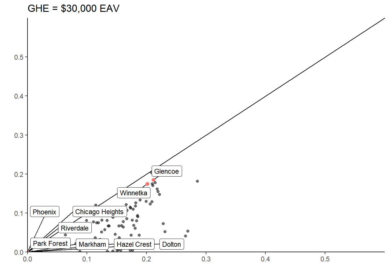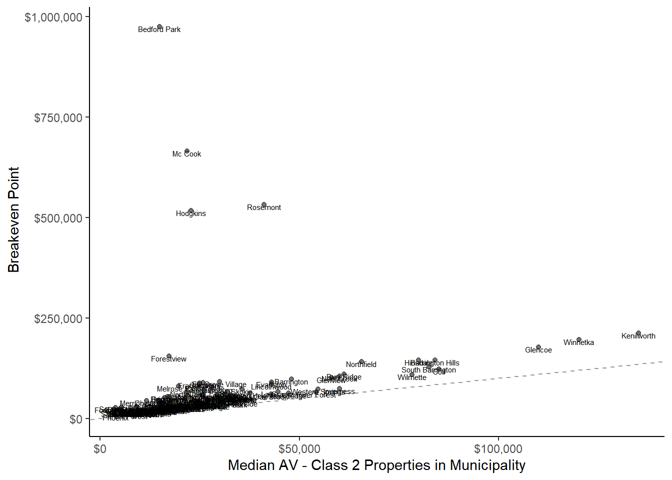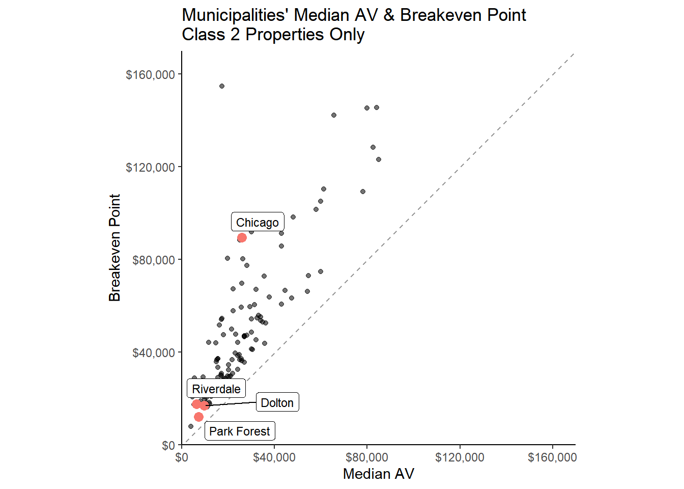 muni_breakeven_points %>%filter(nochange_av <300000) %>%ggplot(aes(y=nochange_av, x = median_AV, label=clean_name )) +geom_abline(intercept =0, slope =1, lty =2, alpha = .4) +geom_point(aes(alpha = .5)) +geom_point(data = (muni_breakeven_points %>%filter(clean_name %in%c("Park Forest", "Chicago", "Winnetka", "Riverdale","Dolton"))), aes(y = nochange_av, x = median_AV, color ="red"), size =3) + ggrepel::geom_label_repel(data = (muni_breakeven_points %>%filter(clean_name %in%c("Park Forest", "Chicago", "Winnetka", "Riverdale", "Dolton"))), aes(y = (nochange_av), x = (median_AV)), size =3)+theme_classic() +theme(panel.background =element_blank()) +scale_x_continuous(labels = scales::dollar, expand =c(0,0), limits =c(0,170000) ) +scale_y_continuous(labels = scales::dollar, expand =c(0,0), limits =c(0,170000) ) +theme(legend.position ="none") +labs(title ="Municipalities' Median AV & Breakeven Point \nClass 2 Properties Only",y ="Breakeven Point", x ="Median AV", # caption = "The breakeven point is the assessed values at which a major class 2 property would not have their taxbill change if the # GHE were eliminated. Excludes outliers: University Park, Bedford Park, McCook, Hodgkins, and Rosemont. Class 2 properties that had# claimed the GHE would have lower taxbills even if the GHE were removed if the AV is above the breakeven point." ) +coord_fixed()#ggsave("breakevenpoint.svg", bg = "transparent")
