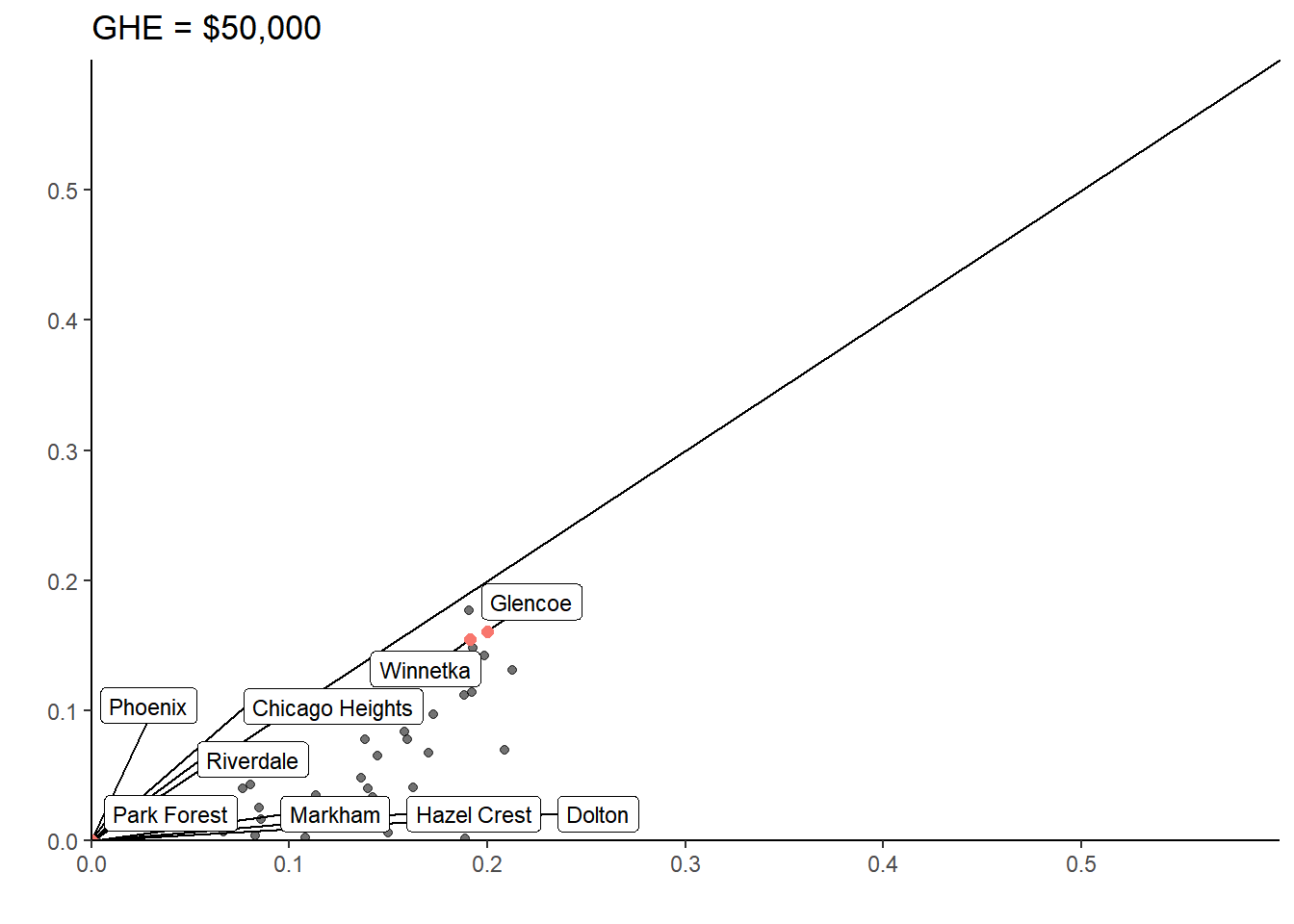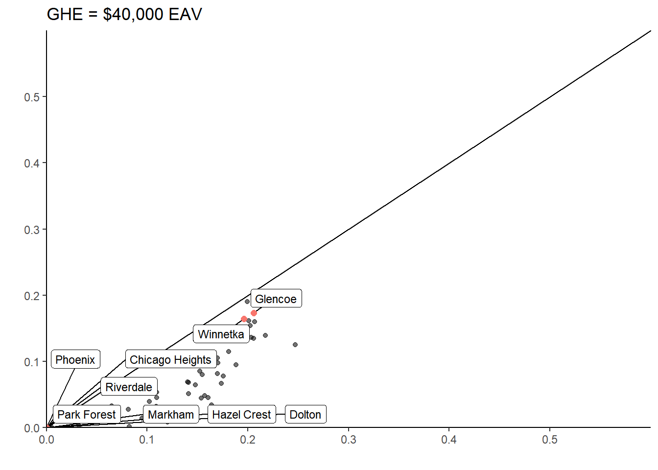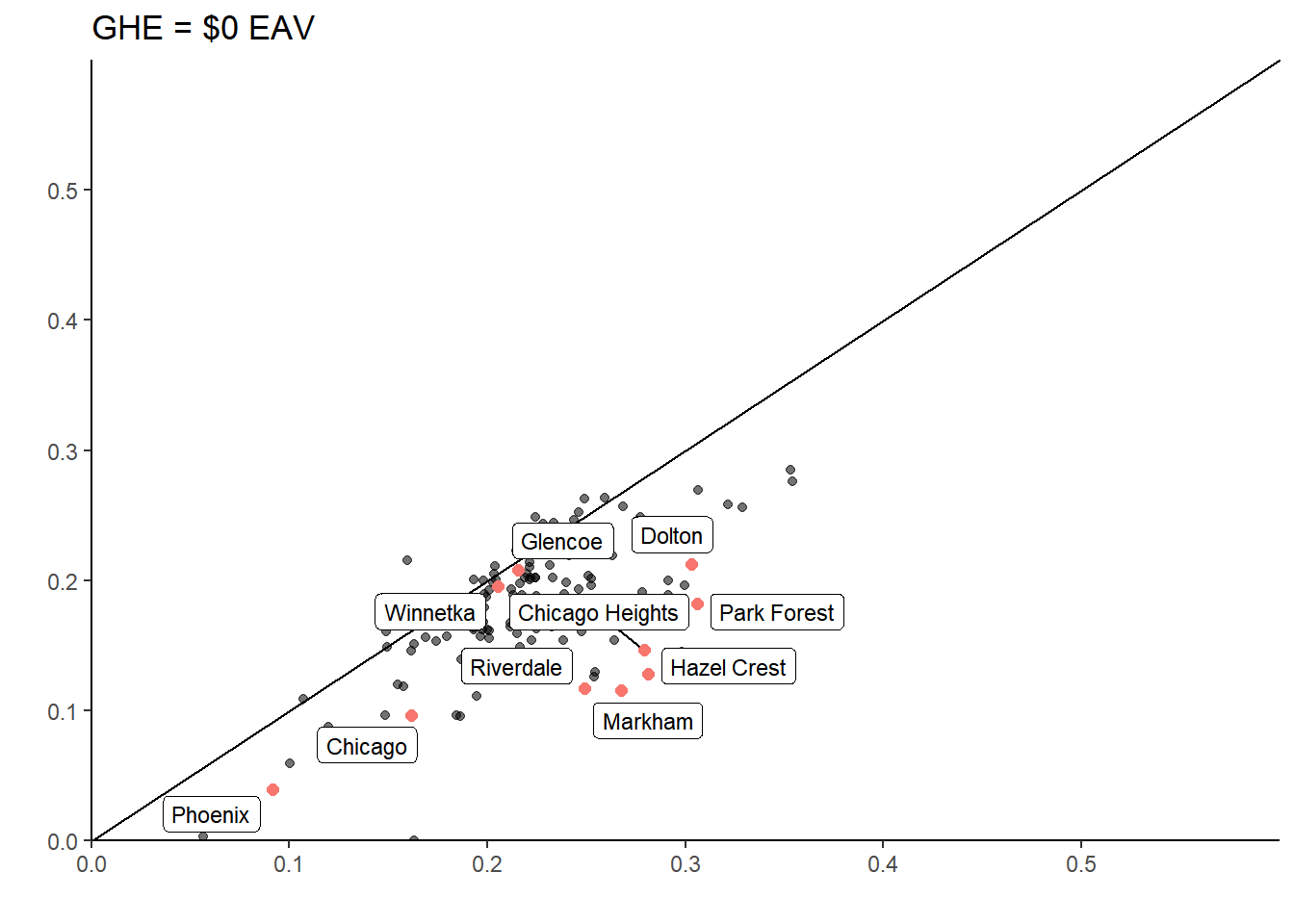 muni_breakeven_points %>%filter(nochange_av <300000) %>%ggplot(aes(y=nochange_av, x = median_AV, label=clean_name )) +geom_abline(intercept =0, slope =1, lty =2, alpha = .4) +geom_point(aes(alpha = .5)) +geom_point(data = (muni_breakeven_points %>%filter(clean_name %in%c("Park Forest", "Chicago", "Winnetka", "Riverdale","Dolton"))), aes(y = nochange_av, x = median_AV, color ="red"), size =3) + ggrepel::geom_label_repel(data = (muni_breakeven_points %>%filter(clean_name %in%c("Park Forest", "Chicago", "Winnetka", "Riverdale", "Dolton"))), aes(y = (nochange_av), x = (median_AV)), size =3)+theme_classic() +theme(panel.background =element_blank()) +scale_x_continuous(labels = scales::dollar, expand =c(0,0), limits =c(0,170000) ) +scale_y_continuous(labels = scales::dollar, expand =c(0,0), limits =c(0,170000) ) +theme(legend.position ="none") +labs(title ="Municipalities' Median AV & Breakeven Point \nClass 2 Properties Only",y ="Breakeven Point", x ="Median AV", # caption = "The breakeven point is the assessed values at which a major class 2 property would not have their taxbill change if the # GHE were eliminated. Excludes outliers: University Park, Bedford Park, McCook, Hodgkins, and Rosemont. Class 2 properties that had# claimed the GHE would have lower taxbills even if the GHE were removed if the AV is above the breakeven point." ) +coord_fixed()#ggsave("breakevenpoint.svg", bg = "transparent")