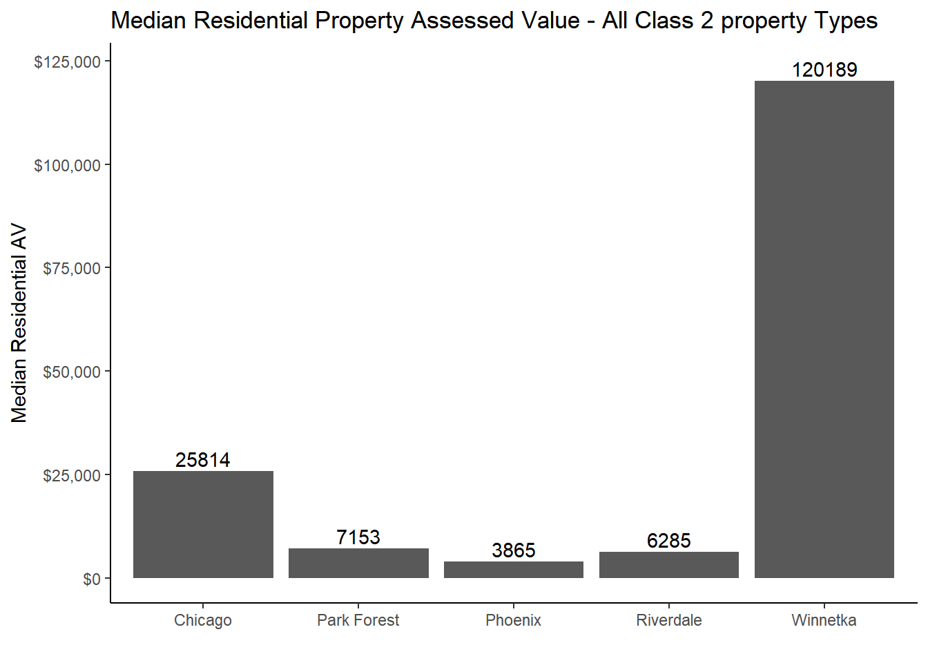 q =c(.1, .25, .5, .75, .9)## ranks properties that are considered C2 properties in order of AV for each Munimuni_quartiles <- c2pins %>%group_by(clean_name) %>%arrange(av) %>%summarize(count_pins =n(), min =min(av),quant10 =round(quantile(av, probs = q[1])), quant25 =round(quantile(av, probs = q[2])), quant50 =round(quantile(av, probs = q[3])),quant75 =round(quantile(av, probs = q[4])),quant90 =round(quantile(av, probs = q[5])),max =max(av) ) %>%arrange(desc(quant50))# Class 2 Descriptive Stats C2_munistats <- c2pins %>%filter(class >199& class <300) %>%group_by(clean_name) %>%arrange(av) %>%summarize(median_eav =round(median(eav_postexemptions)), median_av =round(median(av)), avg_av =round(mean(av)),avg_eav =round(mean(eav_postexemptions)),C2_pins_in_muni =n(),C2_current_exemptions =sum(exe_total_old, na.rm =TRUE),C2_HO_exemps =sum(exe_homeowner, na.rm =TRUE), ) # Class 2 Descriptive Stats C2_munistats_adjusted <- c2pins %>%filter(class >199& class <300) %>%group_by(clean_name) %>%arrange(av) %>%summarize(median_eav =round(median(eav_postexemptions)), median_av =round(median(av)), avg_av =round(mean(av)),avg_eav =round(mean(eav_postexemptions)),C2_pins_in_muni =n(),C2_current_exemptions =sum(exe_total_adj, na.rm =TRUE),C2_HO_exemps =sum(exe_homeowner, na.rm =TRUE), ) # All Class 2 Propertiesmunis_ranked <- c2pins %>%inner_join(muni_quartiles, by =c("clean_name")) %>%mutate(rank =case_when( av > (quant10-500) & (av<quant10+500) ~"q10", av > (quant25-500) & (av<quant25+500) ~"q25", av > (quant50-500) & (av<quant50+500) ~"q50", av > (quant75-500) & (av<quant75+500) ~"q75", av > (quant90-500) & (av<quant90+500) ~"q90") ) %>%select(clean_name, rank, av, pin, class, everything())