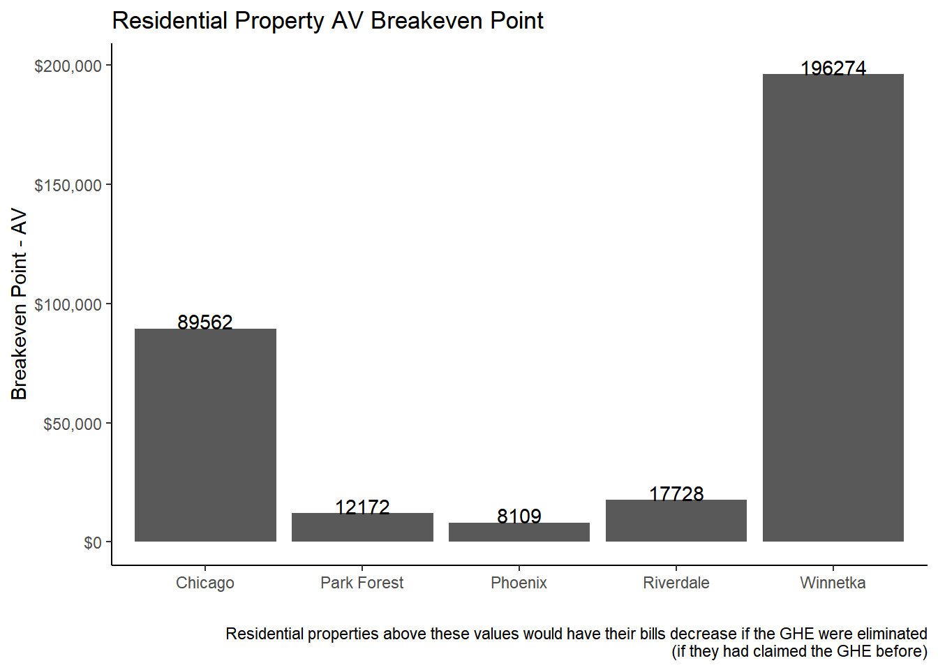 muni_breakeven_points <- c2pins |>left_join(muni_rates) |>filter(exe_homeowner ==10000) %>%filter(exe_senior ==0& exe_freeze ==0& exe_longtime_homeowner ==0& exe_disabled ==0& exe_vet_returning ==0& exe_vet_dis_lt50 ==0& exe_vet_dis_50_69 ==0& exe_vet_dis_ge70 ==0& exe_abate ==0& exe_missing_disvet ==0) %>%group_by(clean_name) %>%summarize(median_AV =median(av), # median class 2 AV for properties that did claim the GHE but not other exemptionsbill_current =mean(eav_postexemptions * tax_code_rate), # money collected by non-TIF agenciesbill_noGHE =mean(rate_noGHE * (eav_postexemptions+exe_homeowner)), # this uses tax code tax rate# rate_change = mean(tax_code_rate - tc_hyp_taxrate), # avg tax code level rate change muni_avg_rate_change =mean(tax_code_rate - rate_noGHE),# nobillchange_propertyEAV = round(mean(exe_homeowner * # (tax_code_rate / (tax_code_rate-tc_hyp_taxrate)))), # nobillchange_propertyEAV_muni =round(mean(exe_homeowner * (rate_current/(rate_current-rate_noGHE) ))) ) |>mutate(nochange_av = nobillchange_propertyEAV_muni / eq_factor,nochange_av_muni = nobillchange_propertyEAV_muni/ eq_factor, ) muni_breakeven_points %>%filter(clean_name %in%c("Chicago","Park Forest", "Phoenix", "Riverdale", "Winnetka")) |>ggplot(aes(y=median_AV, x = clean_name)) +geom_col()+geom_text(aes(y=median_AV +3000, label =round(median_AV) ) ) +scale_y_continuous(labels = scales::dollar) +theme_classic() +scale_x_discrete(label =c("Chicago","Park Forest", "Phoenix", "Riverdale", "Winnetka")) +labs(y ="Median Residential AV", x ="", title ="Median Residential Property Assessed Value - All Class 2 property Types")muni_breakeven_points %>%filter(clean_name %in%c("Chicago","Park Forest", "Phoenix", "Riverdale", "Winnetka")) |>ggplot(aes(y=nochange_av, x = clean_name)) +geom_col() +geom_text(aes(y=nochange_av +3000, label =round(nochange_av)) ) +scale_y_continuous(labels = scales::dollar) +theme_classic() +scale_x_discrete(label =c("Chicago", "Park Forest", "Phoenix", "Riverdale", "Winnetka")) +labs(y ="Breakeven Point - AV", x ="", title ="Residential Property AV Breakeven Point", caption ="Residential properties above these values would have their bills decrease if the GHE were eliminated (if they had claimed the GHE before)")