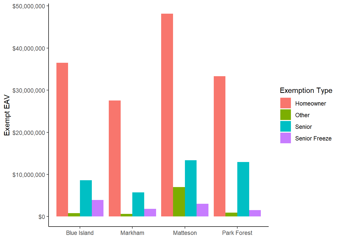 pin_data %>%group_by(clean_name) %>%summarize(all_exemptions =sum(exe_total_adj),eq_av =sum(av_clerk*eq_factor),tif_increment_eav =sum(final_tax_to_tif/tax_code_rate) ) %>%mutate(taxable_eav = eq_av - tif_increment_eav - all_exemptions) |>filter(clean_name %in%c("Blue Island", "Markham", "Matteson", "Park Forest")) %>%pivot_longer(cols =c(all_exemptions:taxable_eav), names_to ="exe_type") %>%# all exemptions includes all exemptions, but adjusted for missing disabled veteran exemptions filter(exe_type %in%c("taxable_eav", "all_exemptions"))|>mutate(EAV =factor(exe_type, levels =c("taxable_eav", "all_exemptions"), labels =c("Taxed EAV", "Exempt EAV")) ) |>ggplot() +geom_col(aes(x=clean_name, y = value, fill = EAV), position ="stack") +scale_y_continuous(label = scales::dollar, limits =c(0,600000000)) +theme_classic() +geom_text(aes(x=clean_name, y = value, label = scales::comma(value)), position ="stack", vjust=1.1)+labs(x =element_blank(), y ="Non-TIF Increment EAV in Municipality")