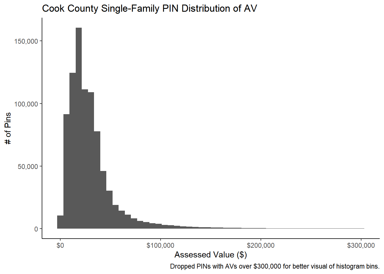 pin_data %>%filter(av <300000) %>%# just to see the histogram betterggplot( aes(x=av)) +geom_histogram(bins =50) +theme_classic()+labs(title ="Cook County Class 2 Residential PIN Distribution of AV", x ="Assessed Value ($)", y="# of Pins", caption ="Dropped PINs with AVs over $300,000 for better visual of histogram bins.") +scale_x_continuous(label = scales::dollar) +scale_y_continuous(label = scales::comma)singfam_pins %>%filter(av <300000) %>%# just to see the histogram betterggplot( aes(x=av)) +geom_histogram(bins =50) +theme_classic()+labs(title ="Cook County Single-Family PIN Distribution of AV", x ="Assessed Value ($)", y="# of Pins", caption ="Dropped PINs with AVs over $300,000 for better visual of histogram bins." ) +scale_x_continuous(label = scales::dollar)+scale_y_continuous(label = scales::comma)