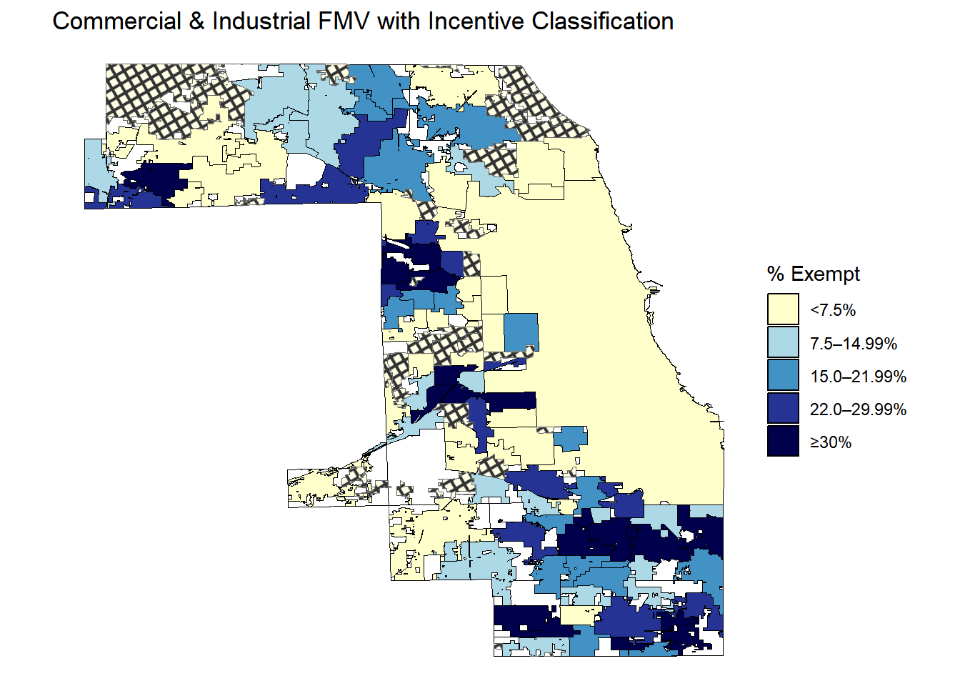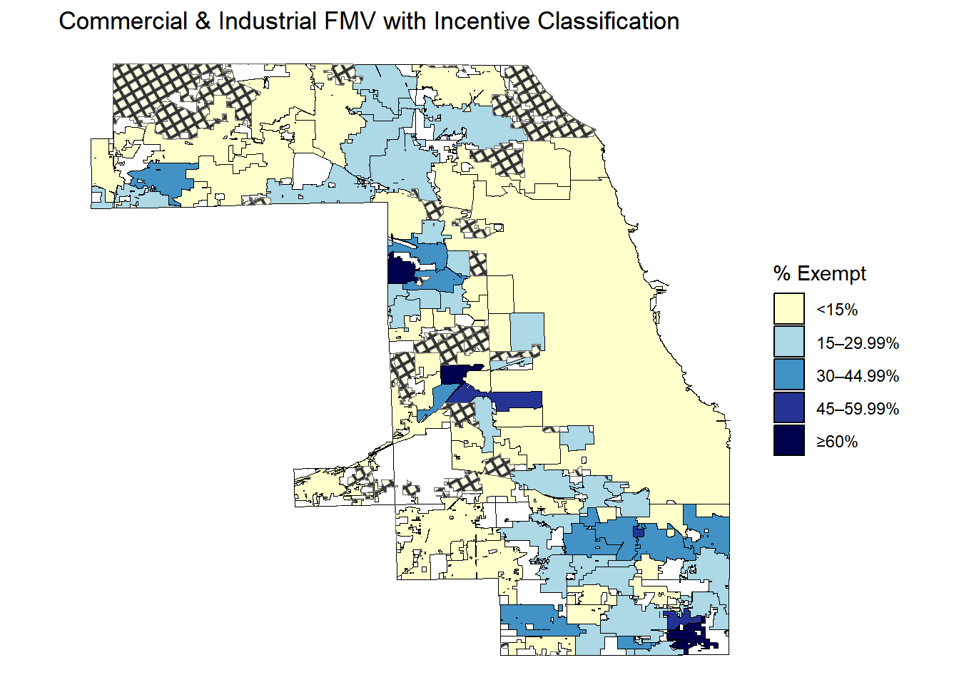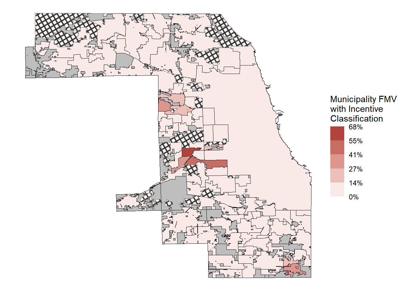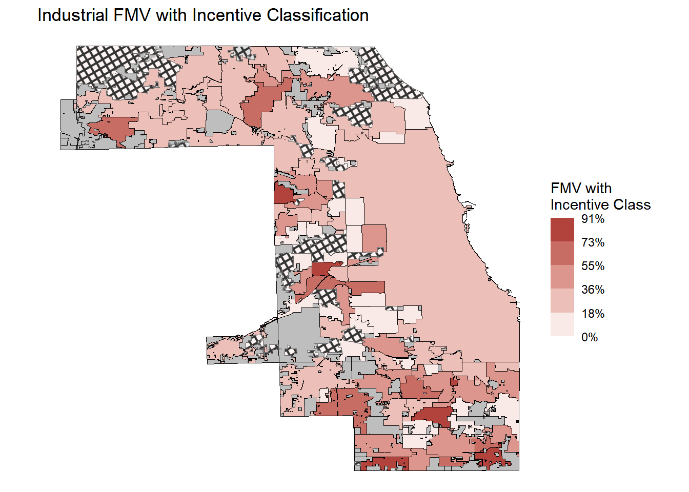 33.25% of industrial FMV has an incentive classification (11.23% when using PIN counts). Of the PINs that have incentive classification, 33.71% of the FMV is located within a TIF ( 31.88% when using PIN counts).