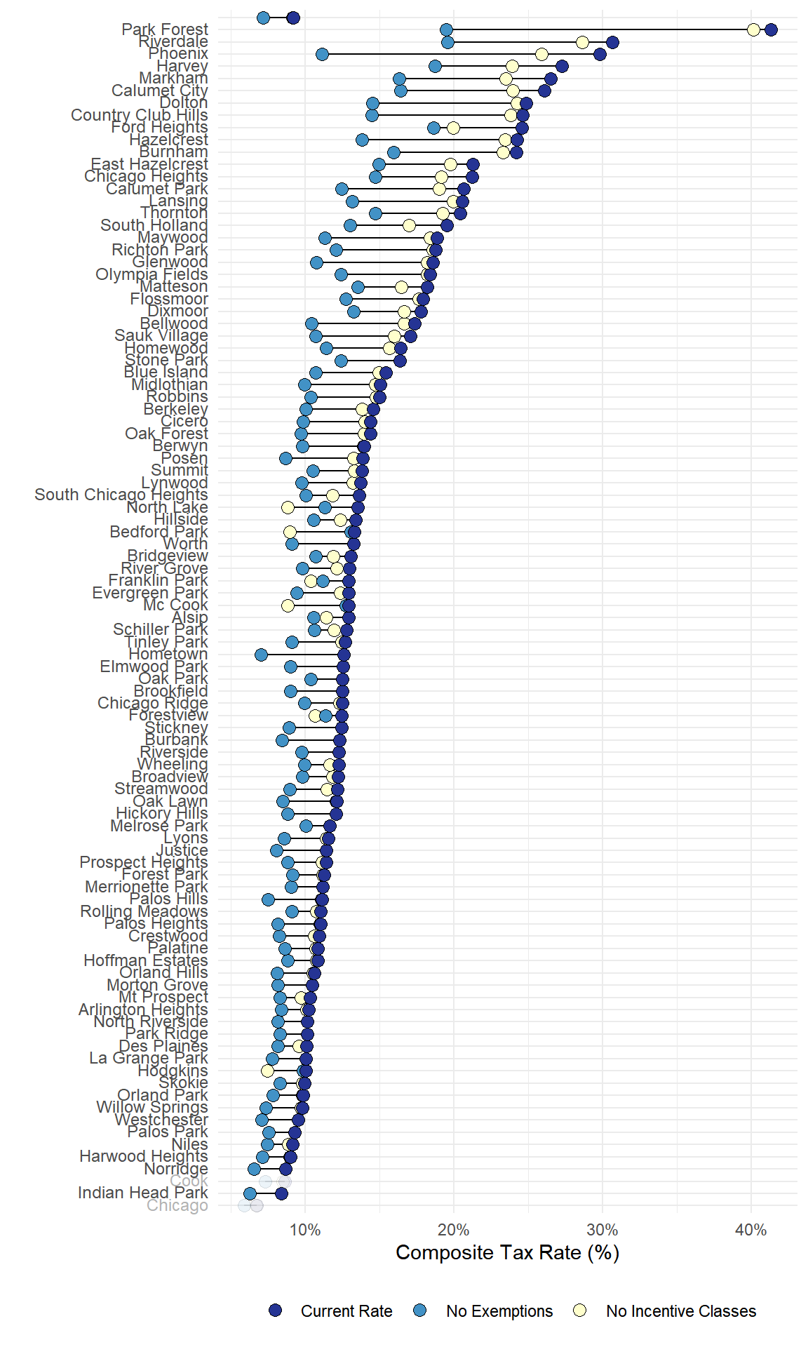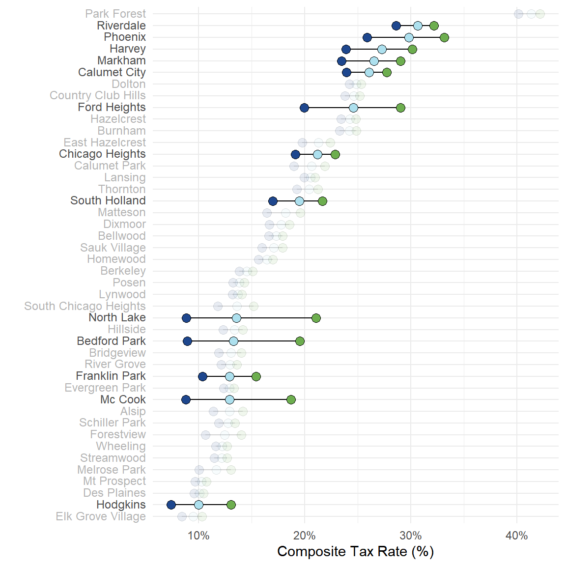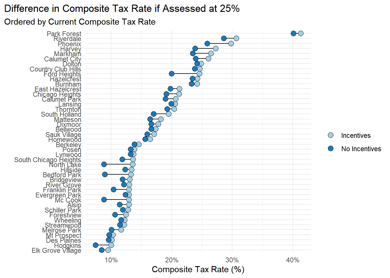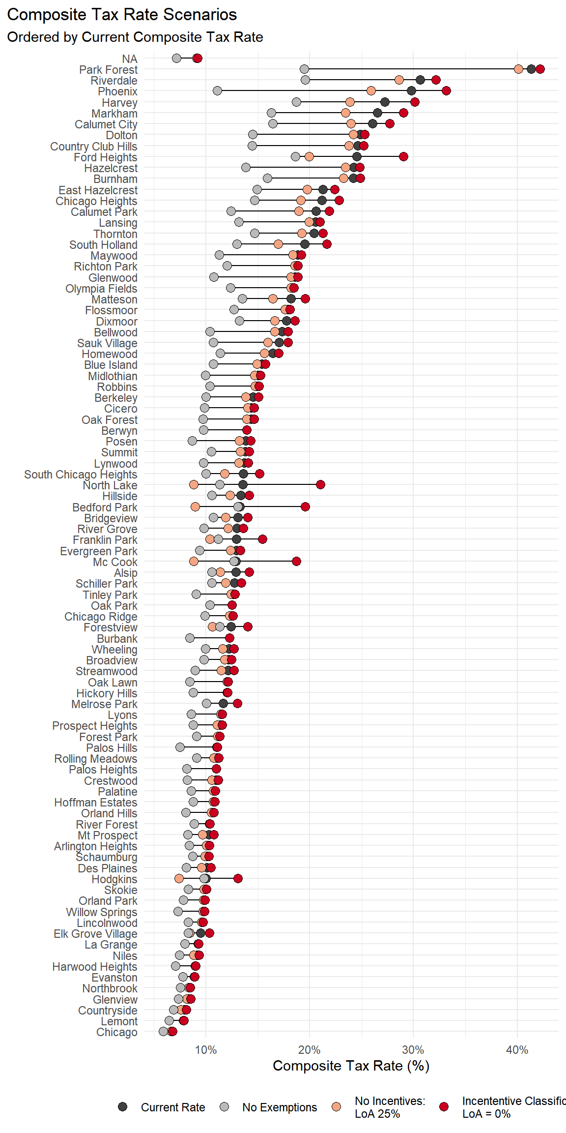 # as a dot graph ## # create order of dotsorder <- muni_ratechange |>as_tibble() |>filter(change_noInc > .005| clean_name =="Chicago") |>arrange(rate_current) |>select(clean_name, rate_current) |>distinct()# make dot graphfigure9_data <- muni_ratechange |>filter(change_noInc > .005) |>select(clean_name, rate_current, rate_noInc, rate_vacant) |>distinct() |>arrange(rate_current) |>pivot_longer(c("rate_current", "rate_noInc", "rate_vacant" ), names_to ="type", values_to ="tax_rate") |>inner_join(order) figure9_data|>ggplot(aes(x = tax_rate, y=reorder(clean_name, rate_current)))+geom_line(aes(group = clean_name))+geom_point(aes(fill=type), size=3, pch =21, color ="black" )+theme_minimal() +theme( legend.title =element_blank(),# legend.position = "bottom",legend.position ="mnone",plot.title.position ="plot",plot.background =element_rect(fill='transparent', color=NA), #transparent plot bgaxis.text.y =element_markdown(size =9) # enable HTML styling in axis labels)+scale_fill_manual(values =c("#ade0ee", "#1e478e", "#6dae4f"),labels =c("Current Rate", "No Incentive Classes: \nLoA = 25%","Incentive Classification\nLoA = 0%") ) +scale_x_continuous(labels = scales::percent)+labs(#title = "Composite Tax Rate Scenarios",#subtitle = "Ordered by Current Composite Tax Rate", x ="Composite Tax Rate (%)", y ="")