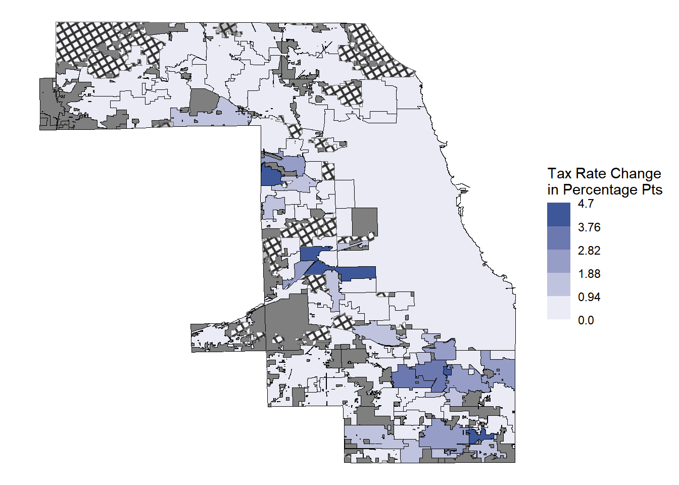 Figure 11.7: Image for Academic Paper. Only shows municipalities that had more than 1/2 percentage point change in tax rate. Municipalities with less than X amount are in grayscale.
