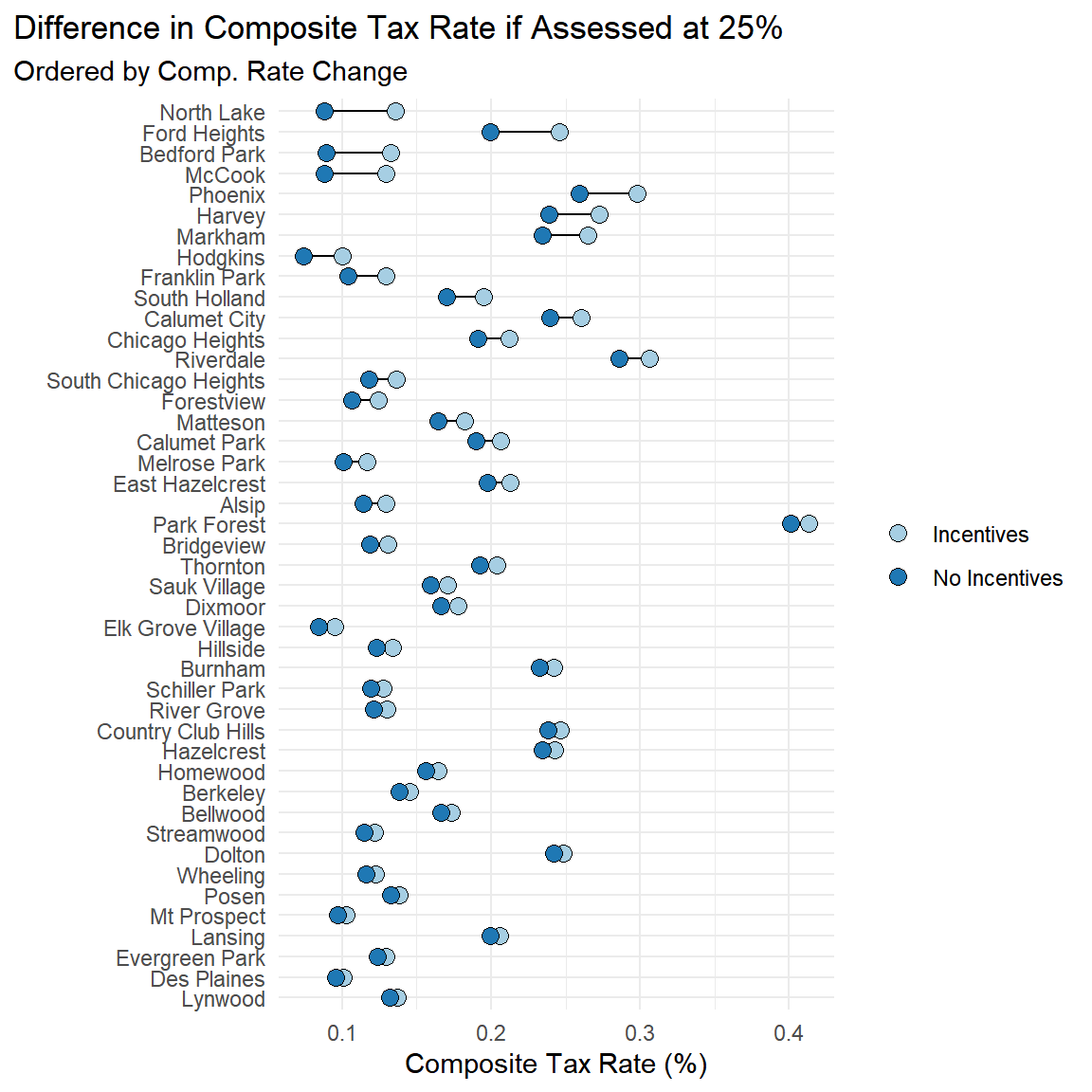 # as a dot graph ## # create order of dotsorder <- muni_ratechange |>as_tibble() |>filter(change_noInc >0) |>arrange(rate_current) |>select(clean_name, rate_current)# make dot graphmuni_ratechange |>filter(change_noInc > .005) |>select(clean_name, rate_current, rate_noInc) |>distinct() |>arrange(rate_current) |>pivot_longer(c("rate_current", "rate_noInc"), names_to ="type", values_to ="tax_rate") |>inner_join(order) |>ggplot(aes(x = tax_rate, y=reorder(clean_name, rate_current)))+geom_line(aes(group = clean_name))+geom_point(aes(fill=type), size=3, pch =21, color ="black" )+theme_minimal() +theme( legend.title =element_blank(),plot.title.position ="plot",plot.background =element_rect(fill='transparent', color=NA) #transparent plot bg )+scale_x_continuous(labels = scales::percent)+scale_fill_brewer(palette="Paired", labels =c("Incentives", "No Incentives"), direction =1)+labs(title ="Difference in Composite Tax Rate if Assessed at 25%",subtitle ="Ordered by Current Composite Tax Rate", x ="Composite Tax Rate (%)", y ="")