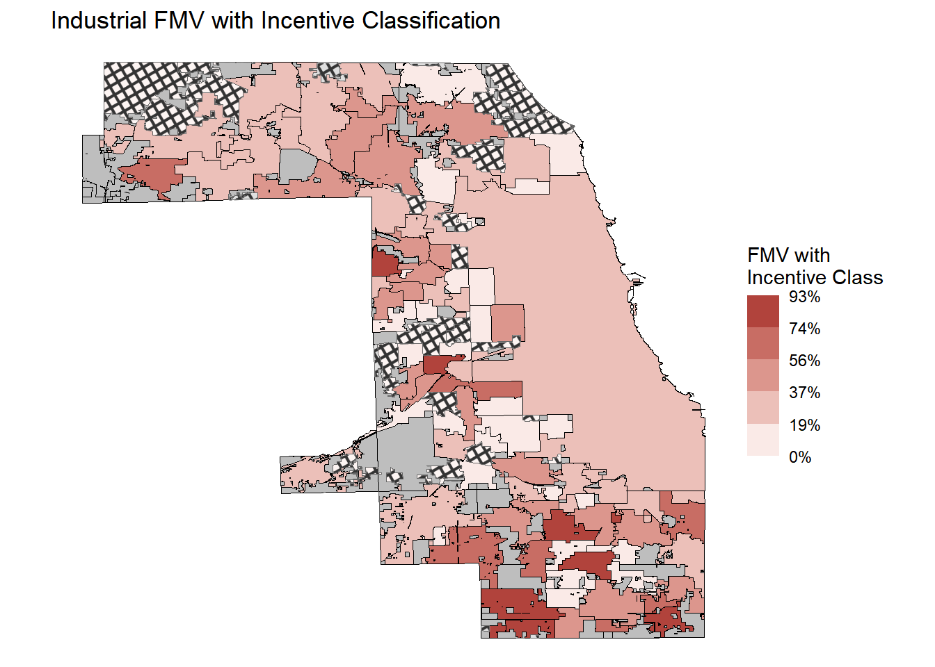 36.74% of industrial FMV has an incentive classification (13.71% when using PIN counts). Of the PINs that have incentive classification, 35.70% of the FMV is located within a TIF ( 44.74% when using PIN counts).