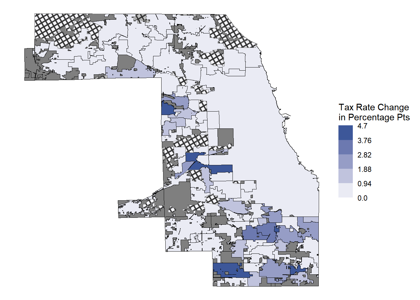 Figure 12.7: Image for Academic Paper. Only shows municipalities that had more than 1/2 percentage point change in tax rate. Municipalities with less than X amount are in grayscale.