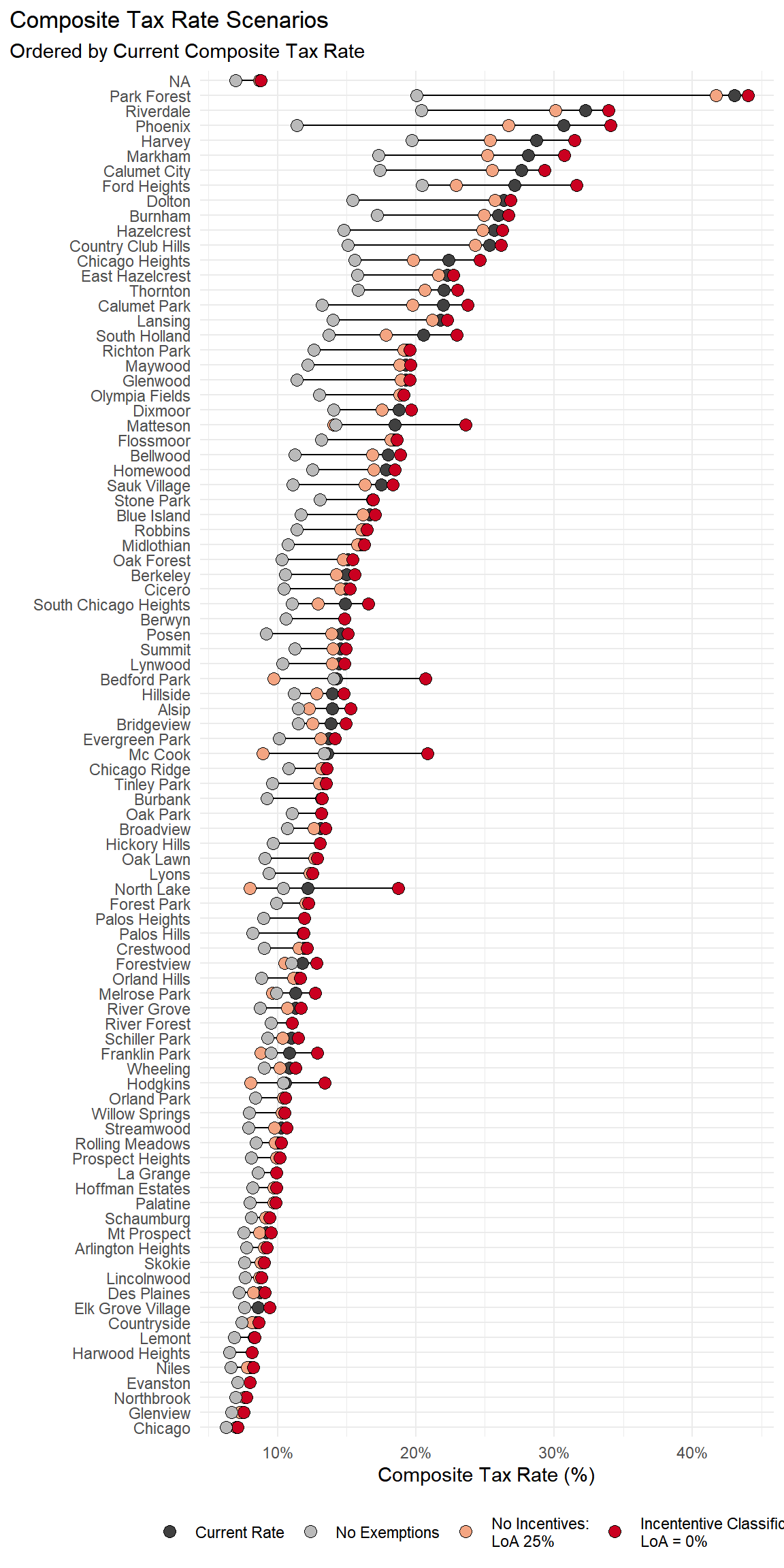 # as a dot graph ## # create order of dotsorder <- muni_ratechange |>as_tibble() |>filter(change_noInc > .005| clean_name =="Chicago") |>arrange(rate_current) |>select(clean_name, rate_current) |>distinct()# make dot graphfigure9_data <- muni_ratechange |>filter(change_noInc > .005) |>select(clean_name, rate_current, rate_noInc, rate_vacant) |>distinct() |>arrange(rate_current) |>pivot_longer(c("rate_current", "rate_noInc", "rate_vacant" ), names_to ="type", values_to ="tax_rate") |>inner_join(order) figure9_data|>ggplot(aes(x = tax_rate, y=reorder(clean_name, rate_current)))+geom_line(aes(group = clean_name))+geom_point(aes(fill=type), size=3, pch =21, color ="black" )+theme_minimal() +theme( legend.title =element_blank(),# legend.position = "bottom",legend.position ="mnone",plot.title.position ="plot",plot.background =element_rect(fill='transparent', color=NA), #transparent plot bgaxis.text.y =element_markdown(size =9) # enable HTML styling in axis labels)+scale_fill_manual(values =c("#ade0ee", "#1e478e", "#6dae4f"),labels =c("Current Rate", "No Incentive Classes: \nLoA = 25%","Incentive Classification\nLoA = 0%") ) +scale_x_continuous(labels = scales::percent)+labs(#title = "Composite Tax Rate Scenarios",#subtitle = "Ordered by Current Composite Tax Rate", x ="Composite Tax Rate (%)", y ="")