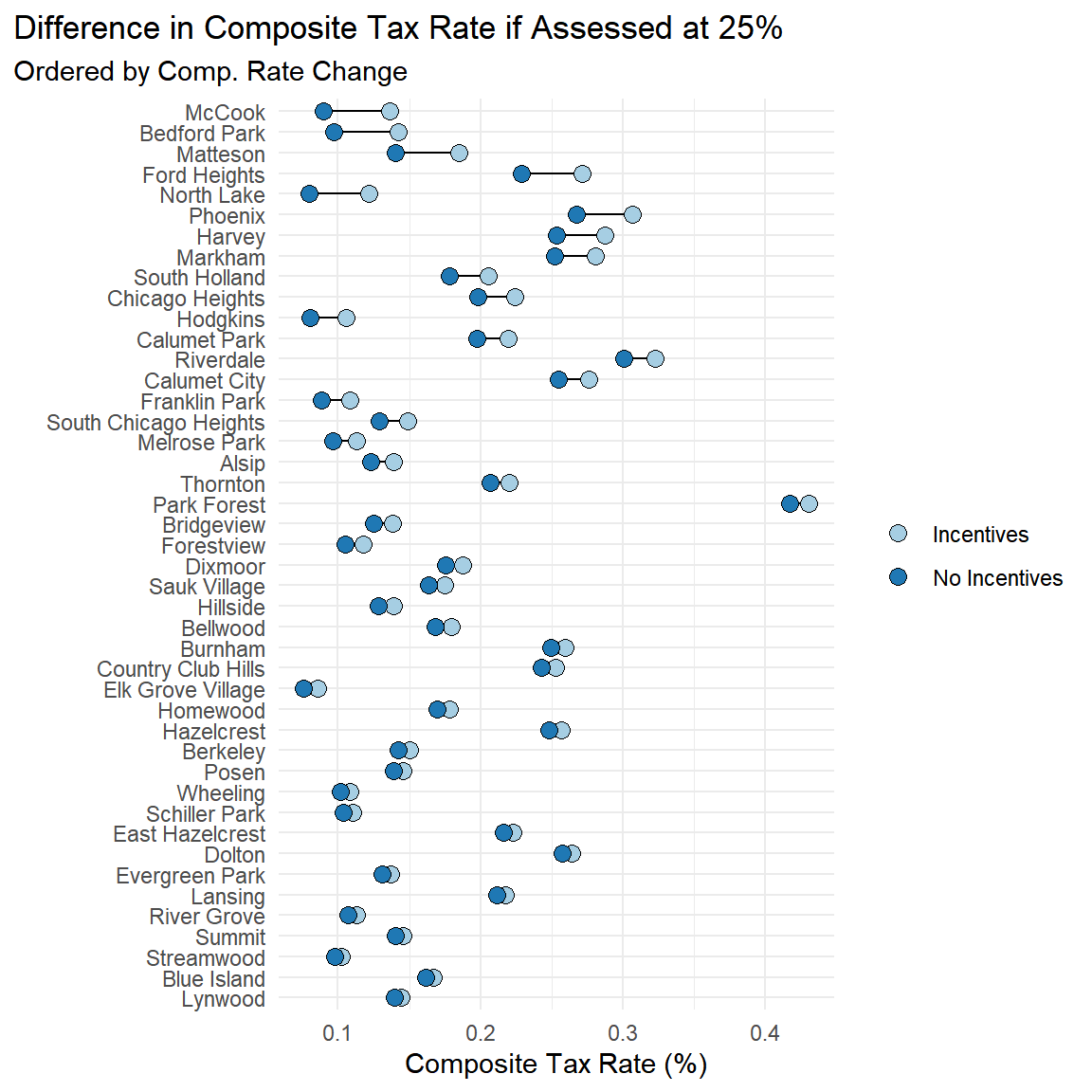 # as a dot graph ## # create order of dotsorder <- muni_ratechange |>as_tibble() |>filter(change_noInc >0) |>arrange(rate_current) |>select(clean_name, rate_current)# make dot graphmuni_ratechange |>filter(change_noInc > .005) |>select(clean_name, rate_current, rate_noInc) |>distinct() |>arrange(rate_current) |>pivot_longer(c("rate_current", "rate_noInc"), names_to ="type", values_to ="tax_rate") |>inner_join(order) |>ggplot(aes(x = tax_rate, y=reorder(clean_name, rate_current)))+geom_line(aes(group = clean_name))+geom_point(aes(fill=type), size=3, pch =21, color ="black" )+theme_minimal() +theme( legend.title =element_blank(),plot.title.position ="plot",plot.background =element_rect(fill='transparent', color=NA) #transparent plot bg )+scale_x_continuous(labels = scales::percent)+scale_fill_brewer(palette="Paired", labels =c("Incentives", "No Incentives"), direction =1)+labs(title ="Difference in Composite Tax Rate if Assessed at 25%",subtitle ="Ordered by Current Composite Tax Rate", x ="Composite Tax Rate (%)", y ="")