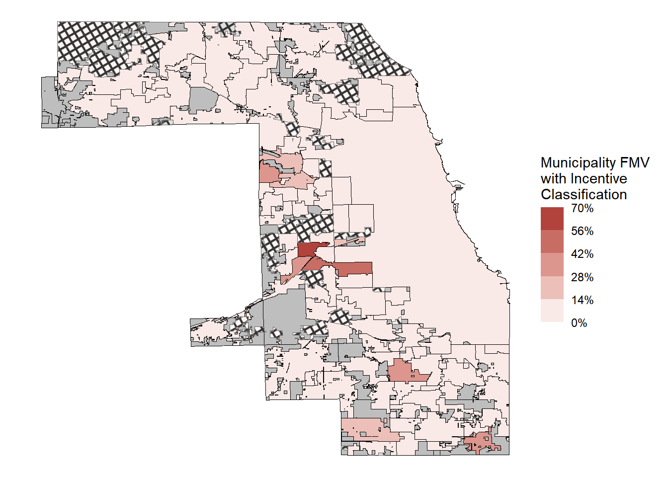 11.25% of industrial and commercial PINs (aka "revenue producing PINs") FMV has an incentive classification (4.55% when using PIN counts). Of the PINs that have incentive classification, 41.52% of the FMV is located within a TIF (4.55% when using PIN counts).